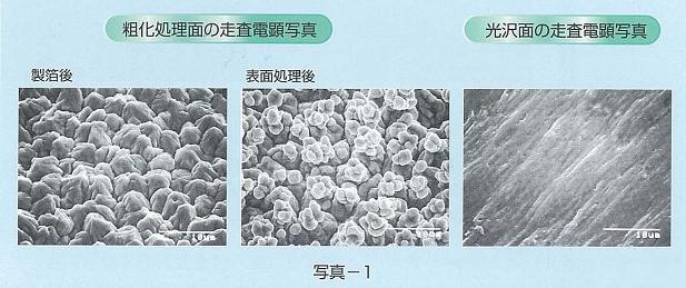 純度・質量厚さ・電気抵抗・表面粗さ・引張強さ・伸び率・耐屈折等の機械的特性は製箔工程での電解条件(液組成・液温・電流・添加剤等)にコントロールされ、STD(IPC規格Grade1)とMP、WS((IPC規格Grade2&3)等に分類されます。 - 表面処理